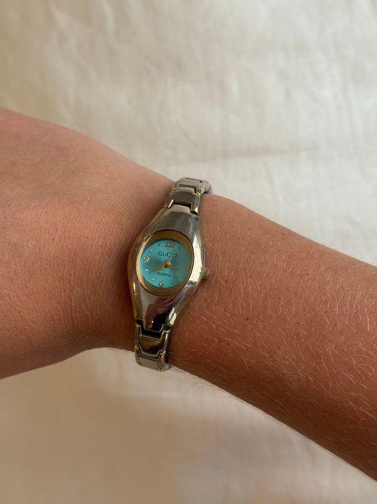 Vintage Gucci Silver and Gold Bubble Watch with Teal Face