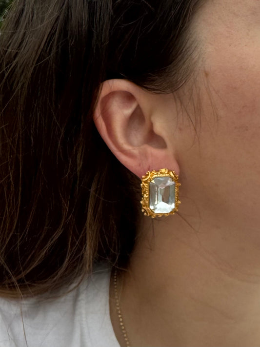 Vintage Gold Tone Square Rhinestone Post Earrings