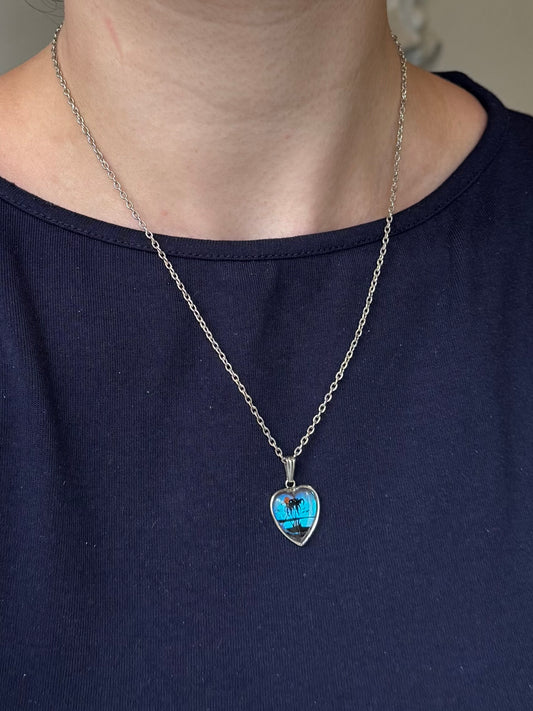 Vintage Sterling Silver Iridescent Palm Tree Heart Pendant Necklace