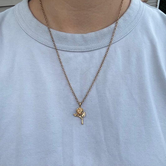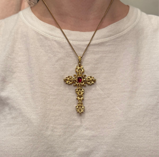 Vintage Avon Gold Tone Ornate Cross Necklace with Red Gemstone