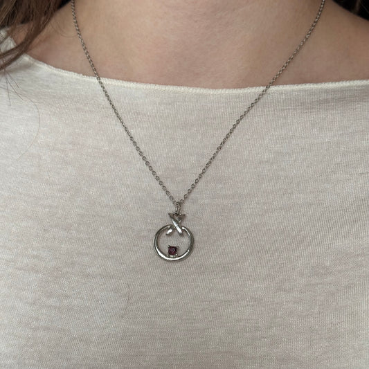 Vintage Silver Pendant Necklace with Red Rhinestone