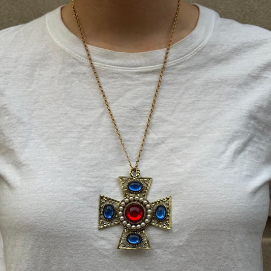 Vintage Gold Tone Rhinestone & Pearl Maltese Cross Necklace