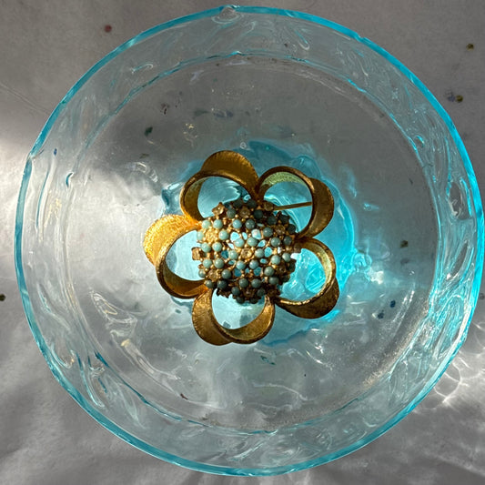 Vintage Gold Flower Brooch with Rhinestones & Teal Stones