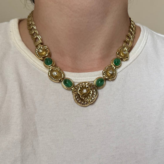 Vintage Gold Necklace with Rhinestones & Green Scarab Stones - Sourced in Paris