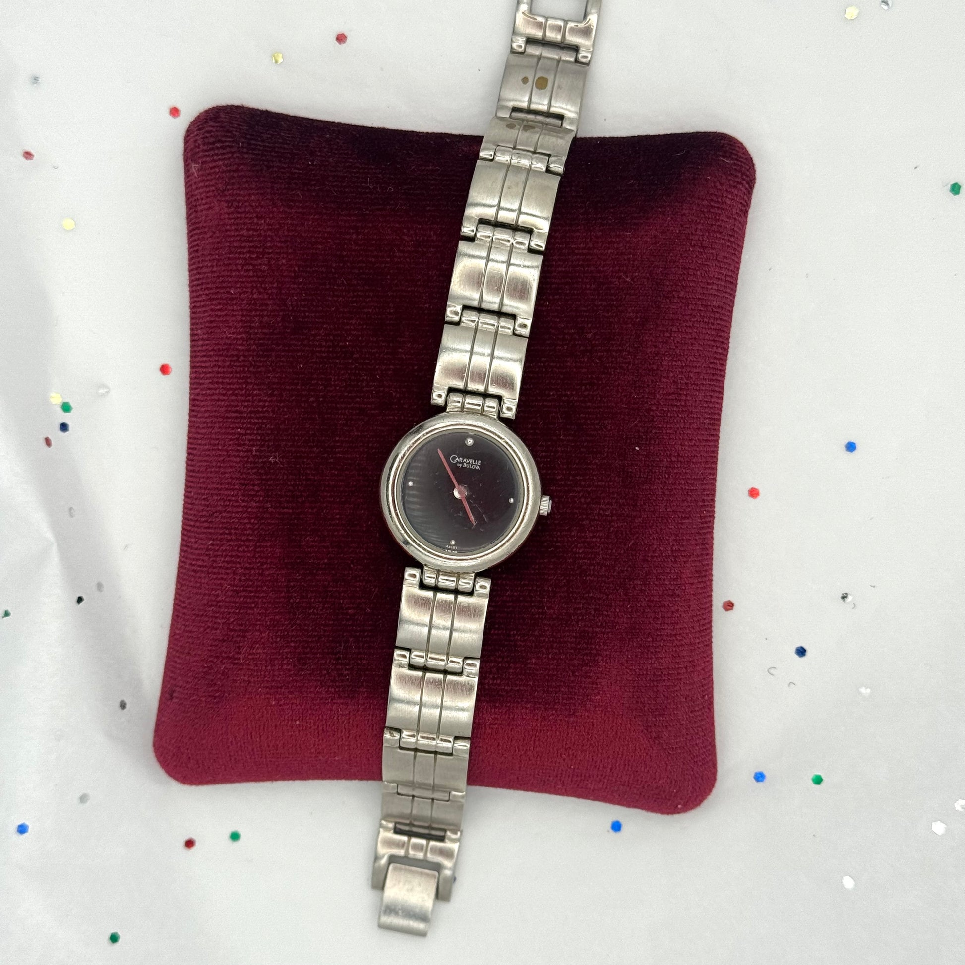 - Vintage Caravelle by Bulova silver watch with black face