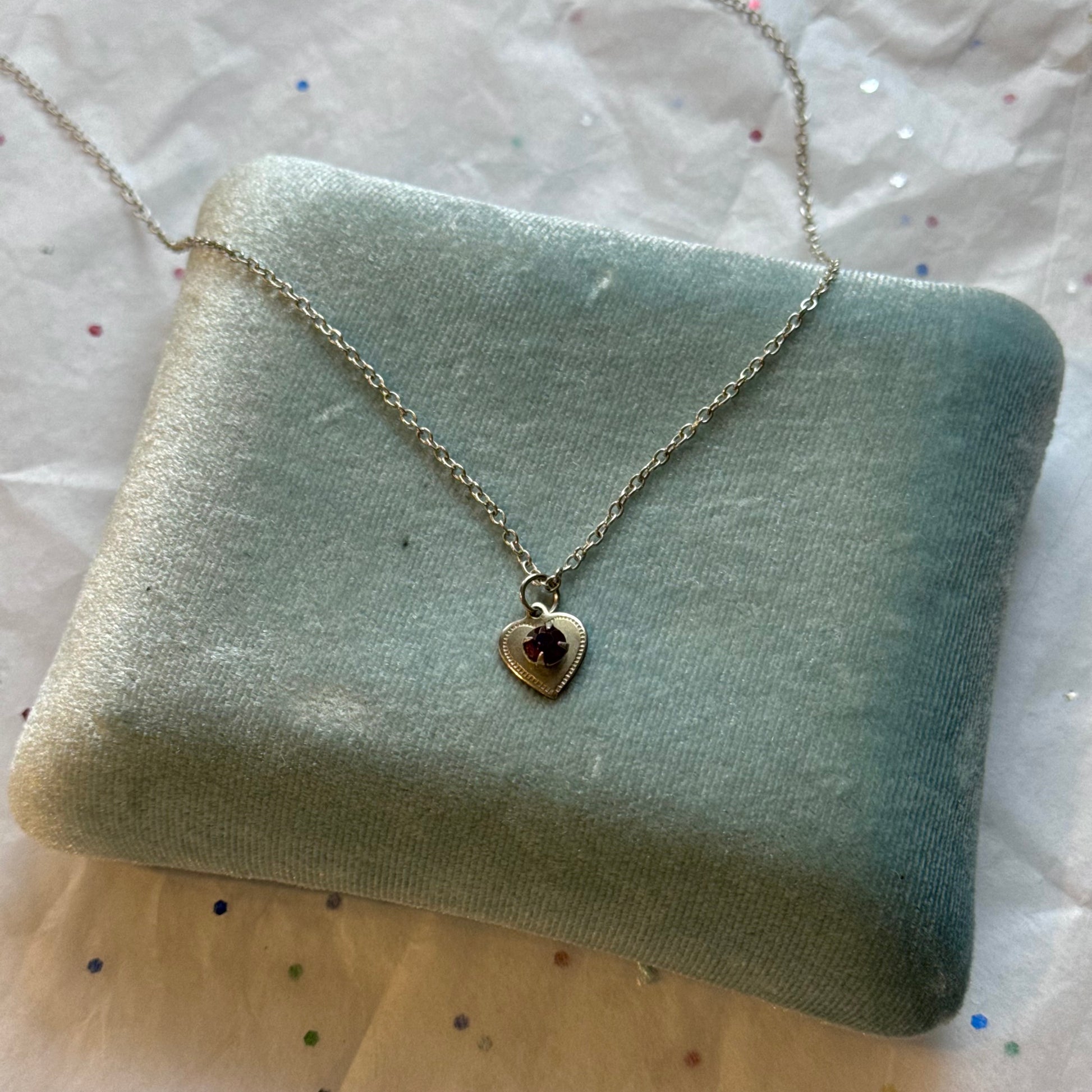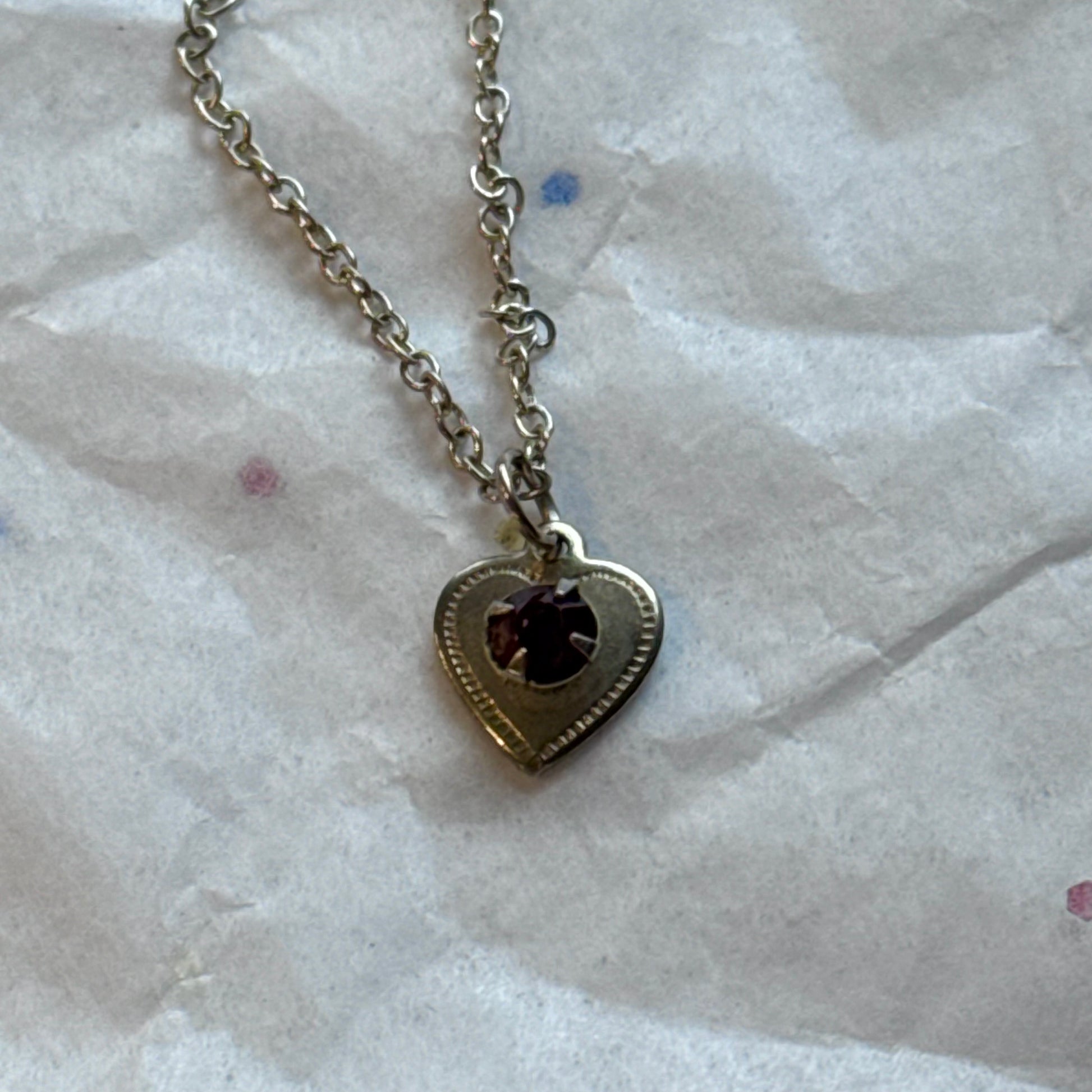 Vintage Silver Heart Pendant Necklace with Red Rhinestone