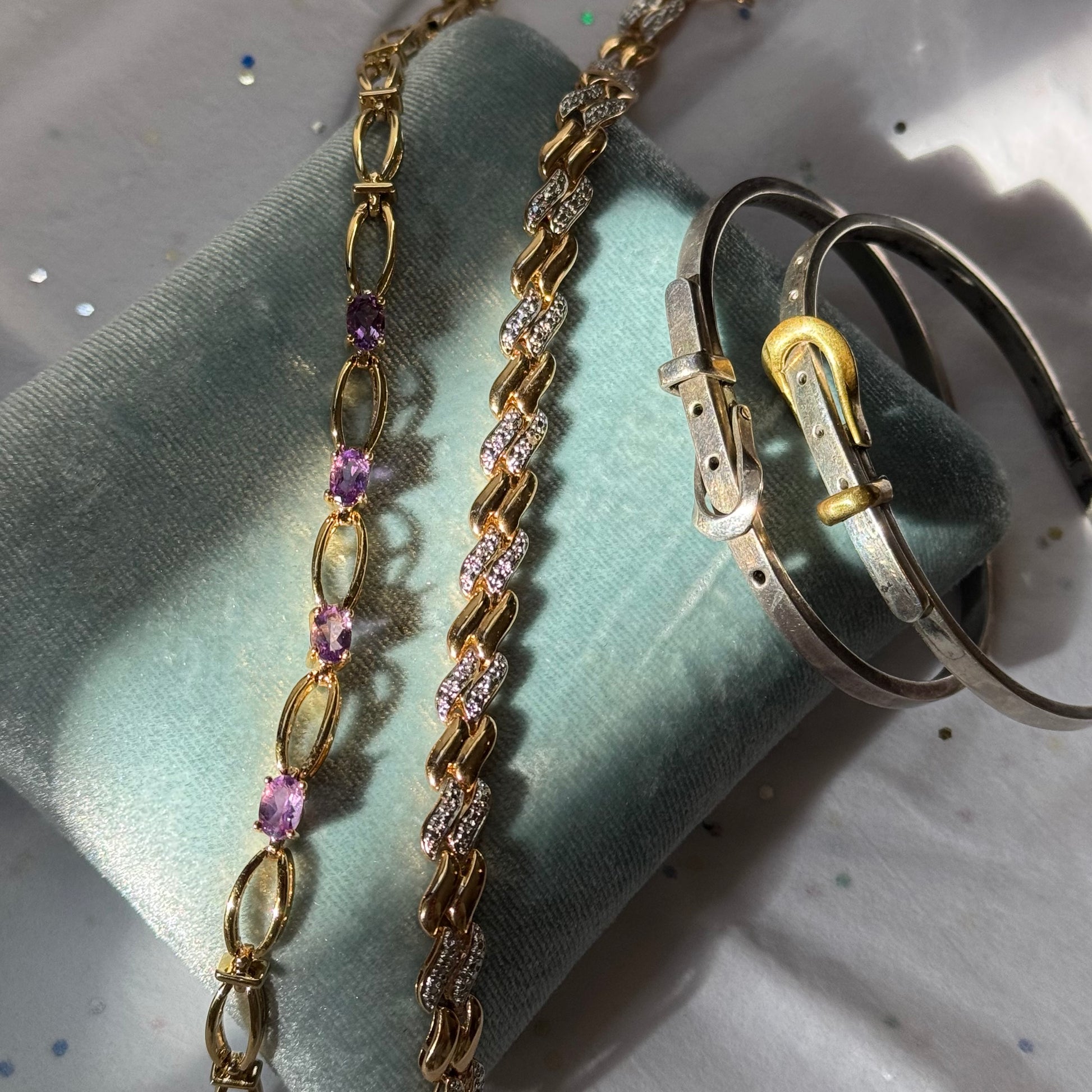- Vintage gold tone bracelet with purple rhinestones