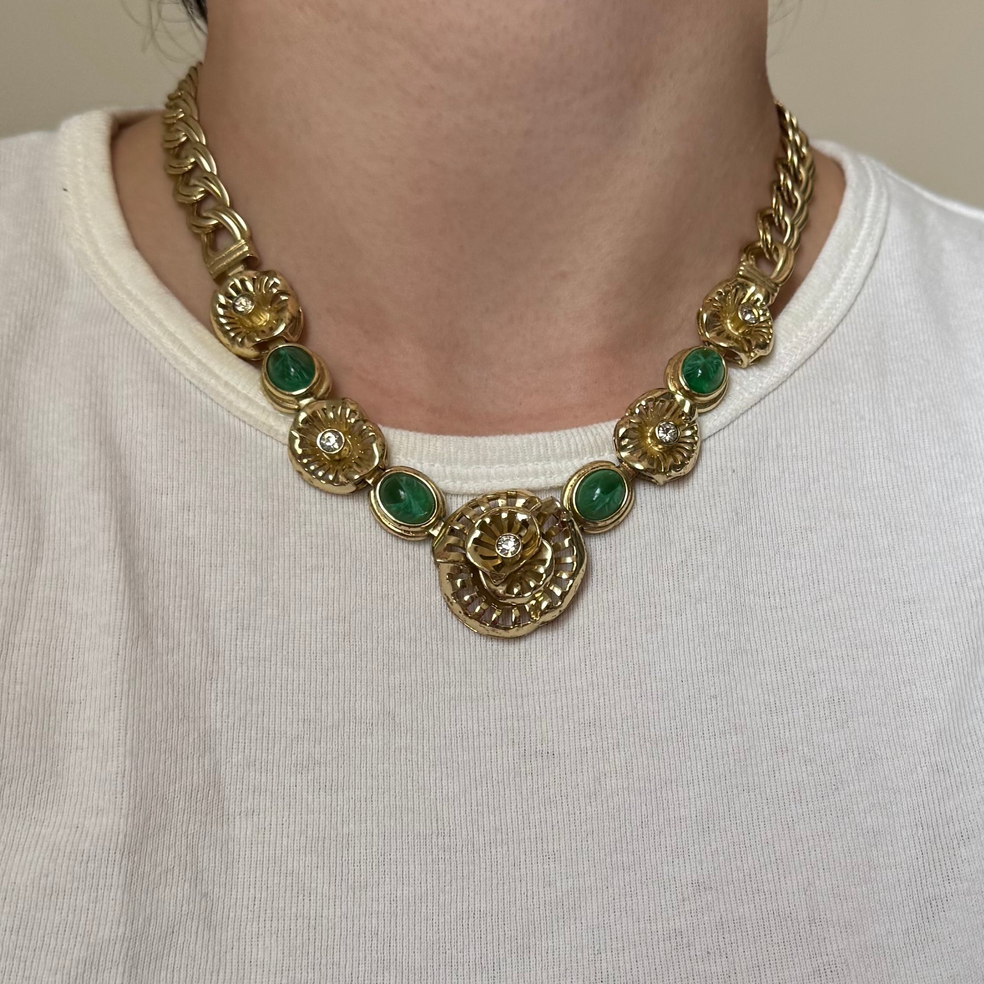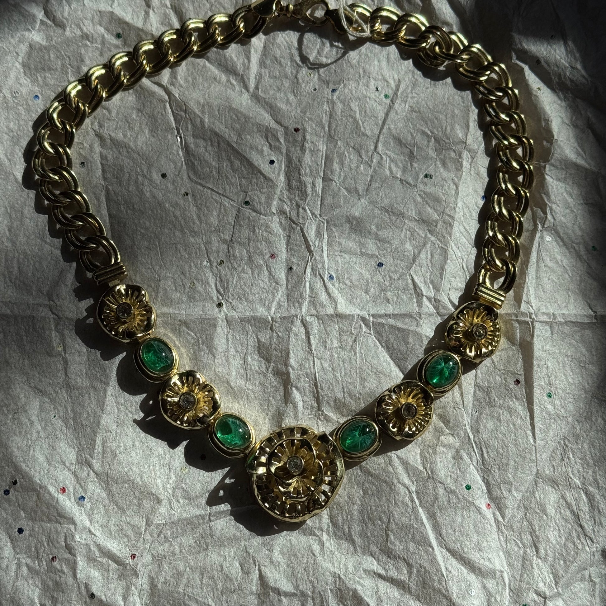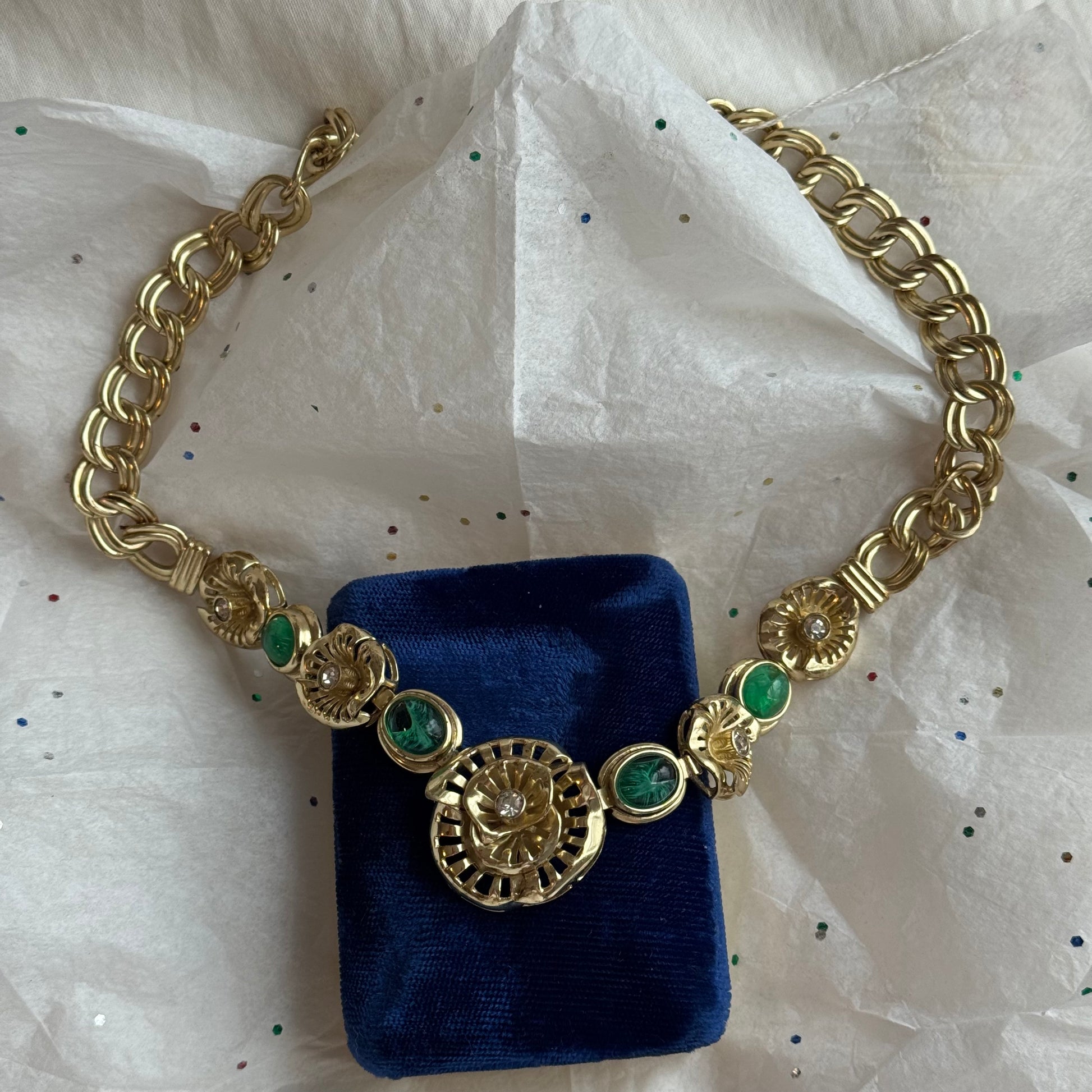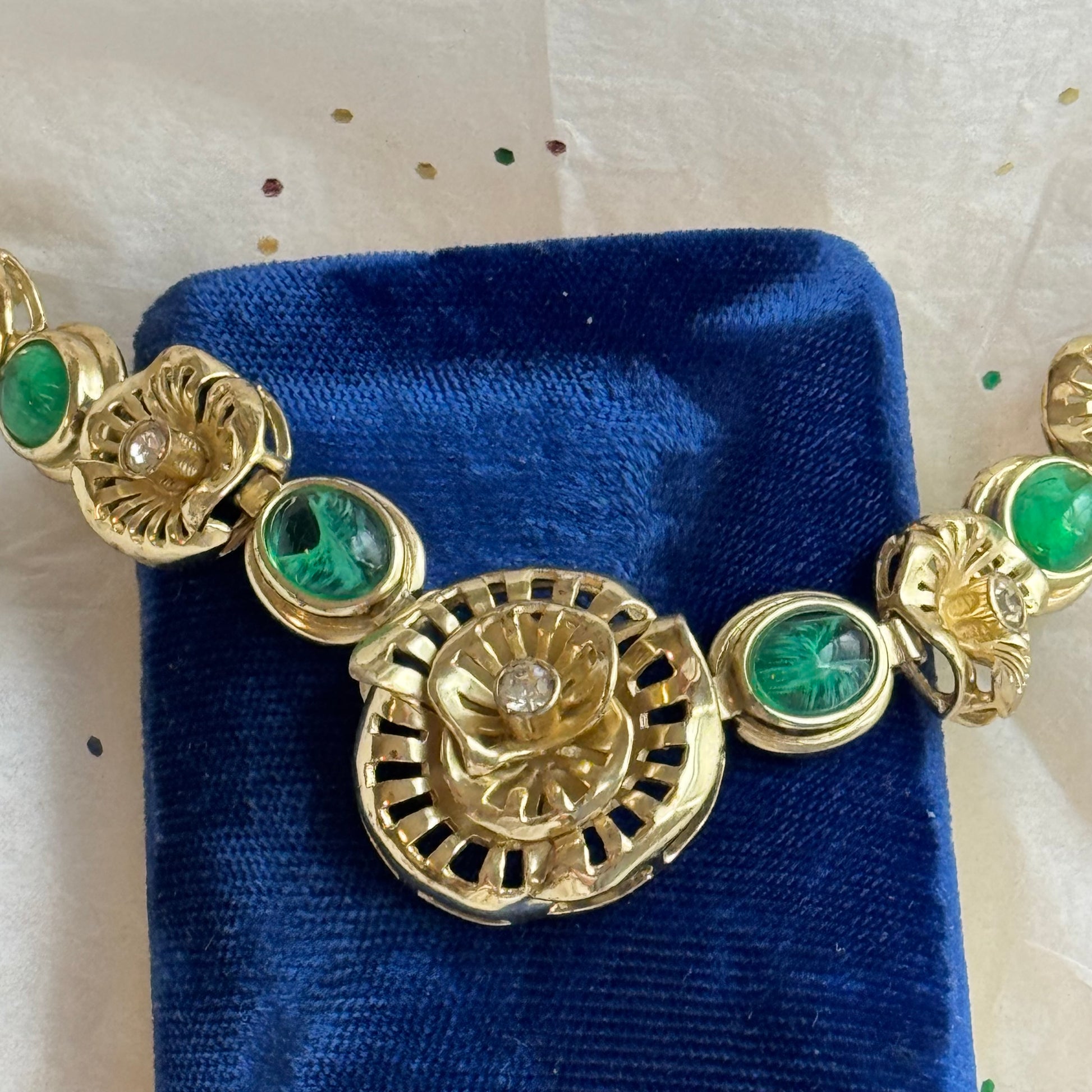 - Vintage gold necklace with rhinestones and green scarab stones - sourced in Paris